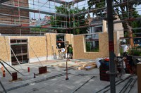De bouw van 2 wijkhuizen, die van start ging in januari 2025, is al goed opgeschoten. Bij het eerste wijkhuis staat de structuur van de gelijkvloerse verdieping er en bij het tweede rezen de eerste innoverende muren ondertussen uit de grond. Beide nieuwe constructies moeten beantwoorden aan de eisen van de lokale verenigingen en de buurtbewoners die een infrastructuur verwachten op maat van hun activiteiten. In het eerste wijkhuis zal plaats zijn voor een gemeentelijke crèche, polyvalente ruimtes en een collectieve keuken, terwijl het tweede wijkhuis – met terras en tuin – sportfaciliteiten, een caféruimte en een fietsherstelatelier krijgt. Dat tweede gebouw is trouwens heel innoverend aangezien het gaat om een geprefabriceerde voorbeeldconstructie met muren uitgerust met isolatie van strobalen, bedekt met aardpleister.
